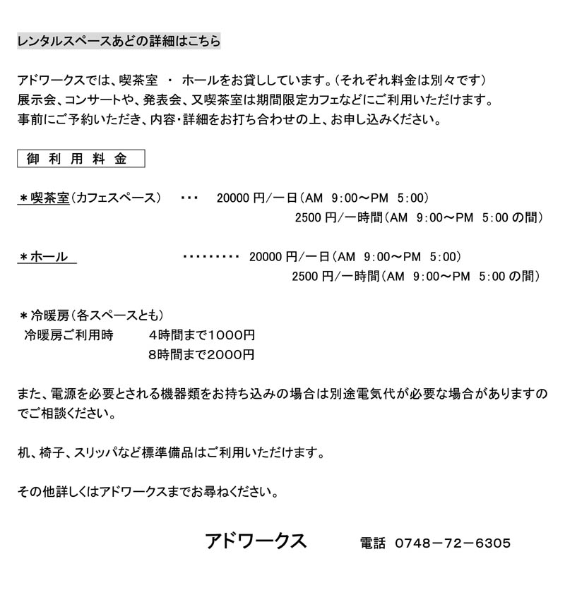 いつもアドワークスをご利用いただき、ありがとうございます。 ご迷惑をおかけしておりました外構フェンスやバルコニーなどのリニューアルも終了し、新たな気持ちで3月〜6月、9月〜12月の毎金、土曜日の2日間カフェを営業させていただきます なお、甚だ恐縮ではありますが、諸物価高騰の影響により、2025年3月より、一部料金改定させていただきます。 ご確認の上、ご予約をお願いいたします。